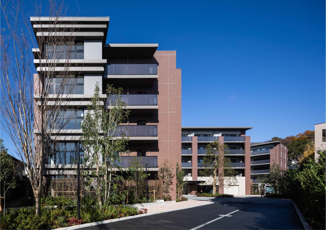 成熟した住宅地と調和する赤レンガ調タイルを外観の基調に、敷地内や周辺の緑と親和性の高い風合いがあるアースカラーのタイル、天然石などを用いて落ち着いたデザインに。歳月を重ねても色褪せない普遍性が住まう方々の愛着を育みます。