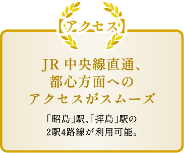 「立川」駅へ直通9分(8分)※JR「昭島」駅より「立川」駅へ直通9分/通勤時(8分/日中)JR中央・青梅線通勤特別快速利用(日中時は快速)