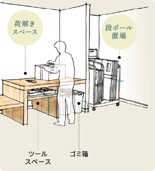 届いた宅配物の梱包などがその場で解けるスペースをご用意しました。段ボールの処分がスムーズにできます。