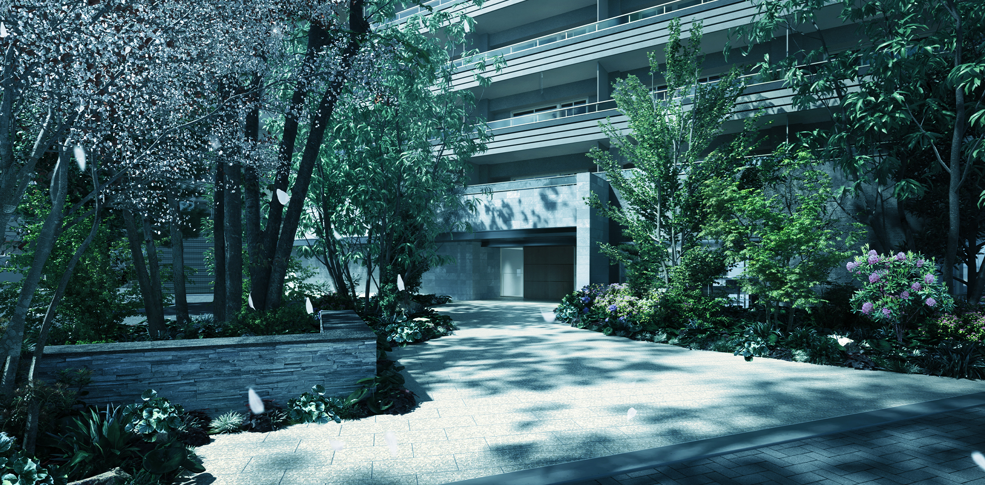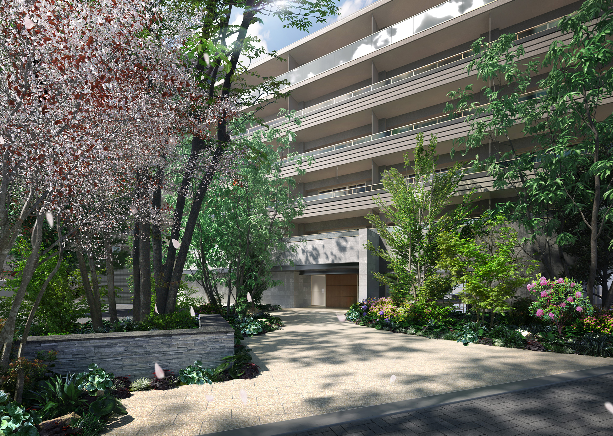 ホテルライクな車寄せや、高さ10mのシラカシや