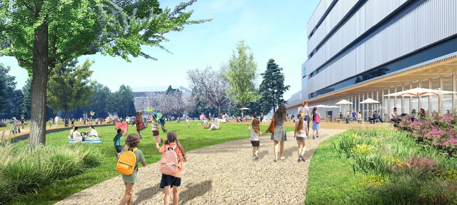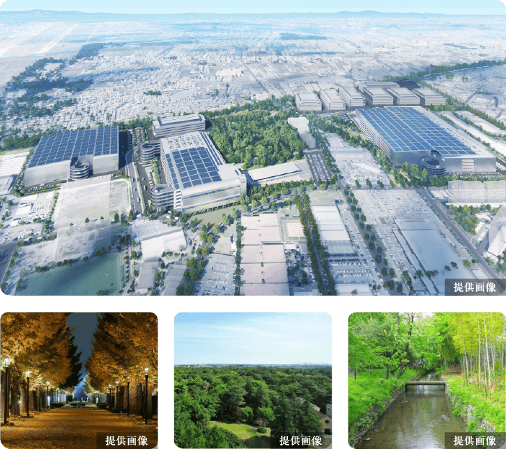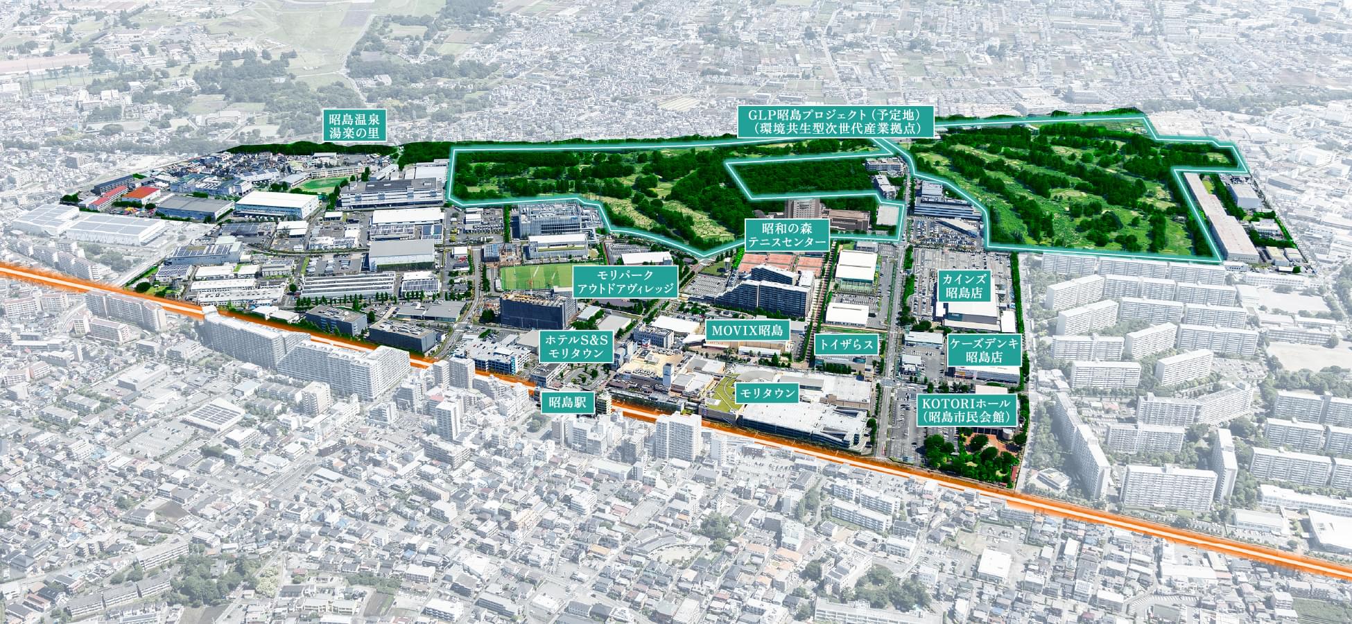 西武立川駅の南側の昭島市域、約58.8haの敷地において、物流施設を中心とした次世代産業拠点の開発が計画されています。 代官山緑地を中心に、北側は中央公園、南側は一部緑を保存及び新植することで緑をつなぎ、また敷地内の歩行空間を整備することで南北のまちと代官山緑地と玉川上水をつなぎます。(建物竣工2029年(予定))