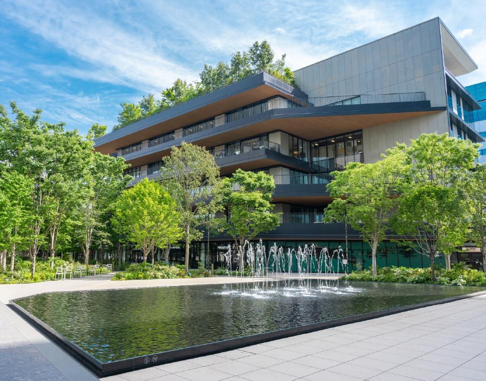 約39,000㎡の敷地に、商業・オフィス・美術館・保育園・ホテル・多目的ホールなどが集結。立川の歴史と未来、そして緑と水が交差する空間として、X型の街路となった中央広場には、ビオトープや噴水、芝生広場などが配置され、心地よい親水空間を形成しています。水が流れる全長120mの階段式のカスケードは、夏の水遊び場として子どもたちに大人気です。
