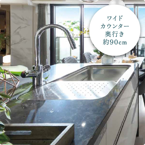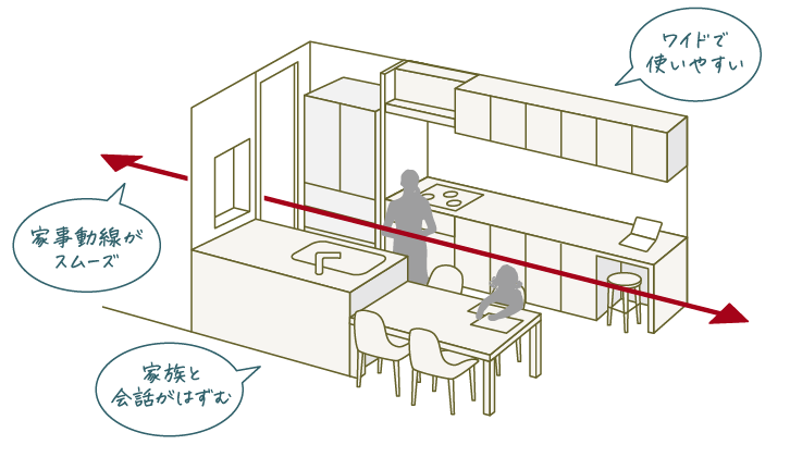壁のない美しくワイドなキッチンで、リビングと家族が自然につながる「キッチンアトリエプラン」。