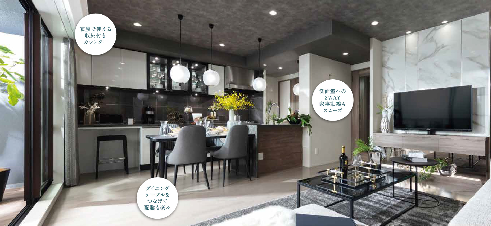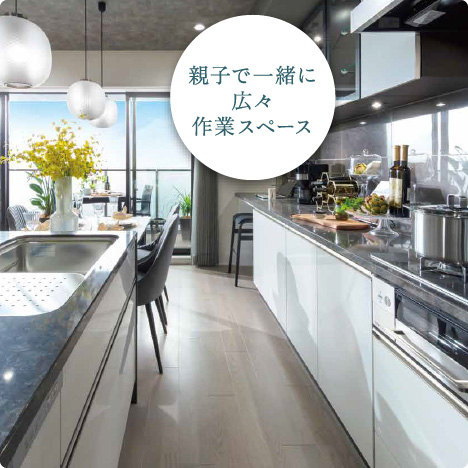 料理をしながら宿題する子どもと会話したり、効率的な家事動線やゆったりした広さや収納も魅力です。
