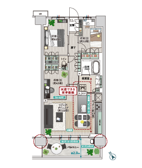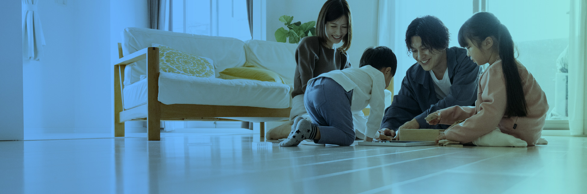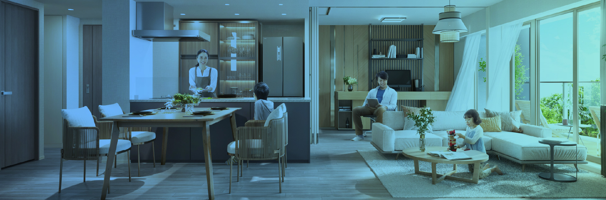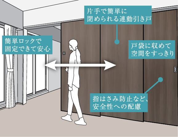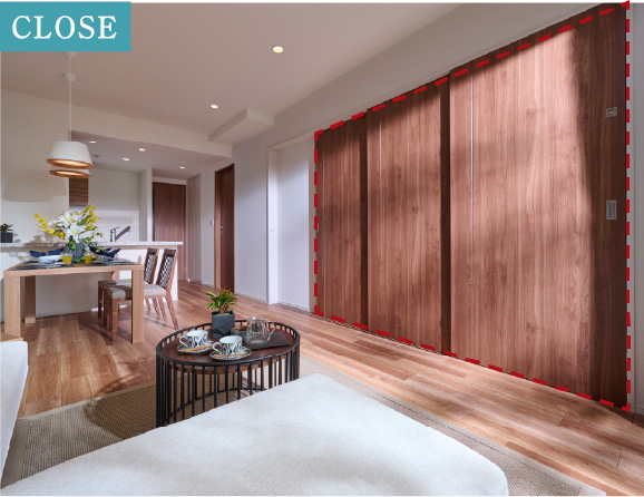 部屋数には限りがある。でも、「暮らしによって、住まいを変えられたら…」そんな想いにお応えするのが、リビング横の可変式3枚引戸の名鉄都市開発オリジナル可動式間仕切り「M'sドア」で、リビングと洋室をひとつの大空間としたり、引戸を閉めて個室として使ったり、家族の成長とともに住まい方を変えたり、と自由なアレンジが可能です。