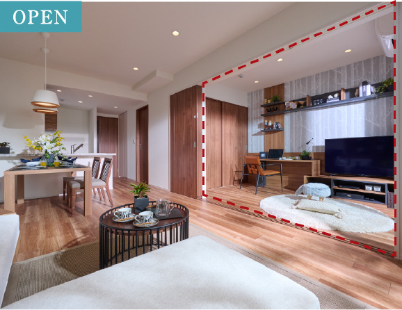 「M’sドア」を開放すると洋室とリビングが一体となった大空間に。家族みんなで寛げるゆとりのスペースです。