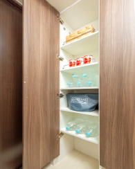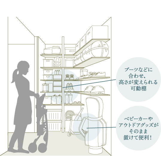 玄関に続いて靴のまま利用できる、シューズインクロゼットをご用意。屋外から運んできたベビーカーやアウトドアグッズもそのまま置けて便利です。