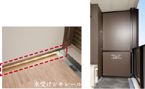 住まいに明るさと開放感を演出する、奥行約2.0mを確保したワイドなバルコニー。戸境にはプライバシーに配慮したハイパーテーション、隣戸への水の侵入を防ぐシキレールを採用しました。