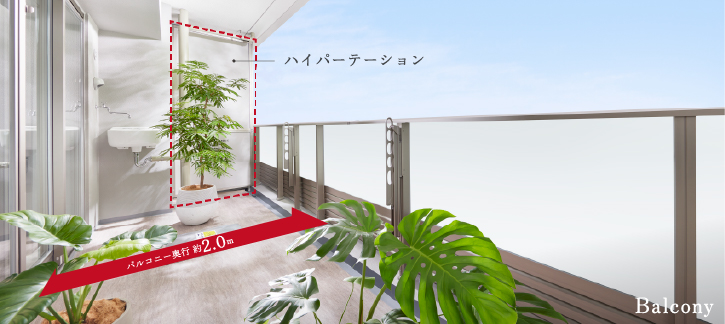 奥行約2.0m、ハイパーテーション採用のバルコニー