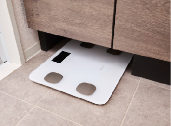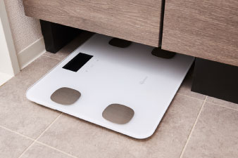 置き場所に困るヘルスメーターを洗面化粧台の下に、すっきりと収納できます。