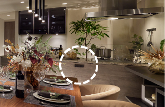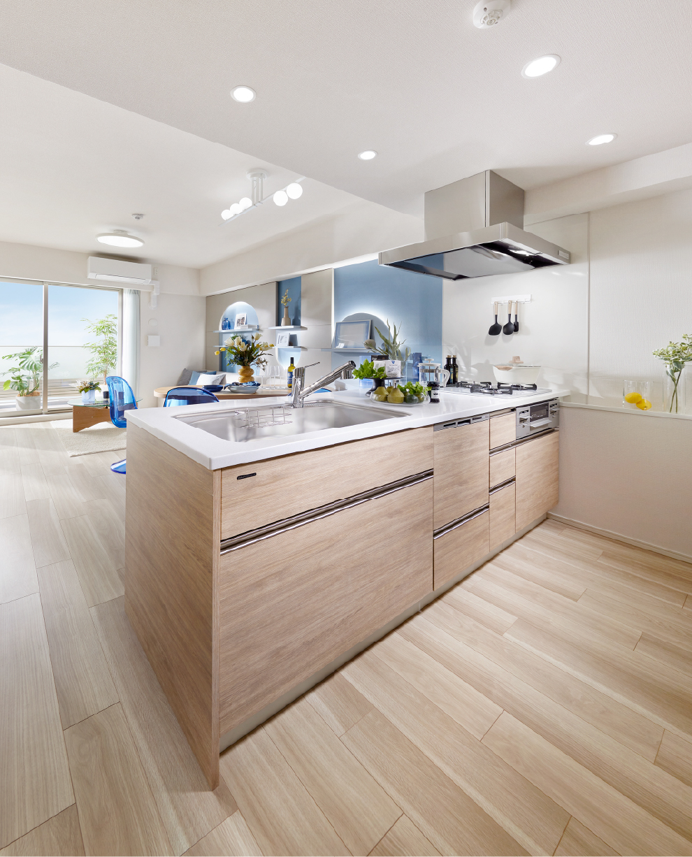これまでの対面式カウンターキッチンの開放感を超える新開発のキッチン。ガスコンロ前面の壁をなくし、ステンレス製レンジフードを採用。リビング・ダイニングとの一体感を高め、家族の会話が一層弾む仕様です。