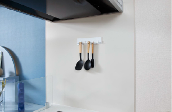 キッチン側面の壁には、油汚れも水拭きでサッと拭き取れるホーローパネルを採用しました。マグネットの取付けも可能です。