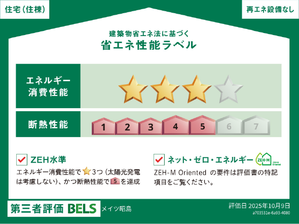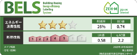 本物件は、建築物の省エネ性能を第三者評価機関が評価し認定する制度「BELS(ベルス)」の取得をしています。電気・ガスなどの一次エネルギー消費量を元に、省エネルギー性能を客観的に評価し、5段階の星マークで表示されます。