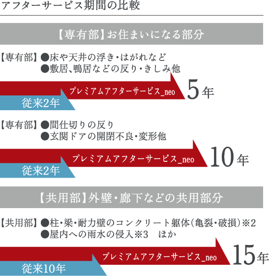 ※1.夜間や土・日・祝日・会社休業日はアウル24センター(マンション管理センター)にて受付し、緊急対応いたします。※2.構造耐力上影響のあるもの(鉄筋のさび汁を伴った亀裂・破損及びこれに準じるものとし、毛細亀裂および軽微な破損は除く)に限ります。※3.おおむね10年目に適切なメンテナンス(トップコート〔アスファルト防水〕塗布、シーリング補修、アスファルトルーフィング〔浮き ・ 剥れ〕の補修、コーチングの打ち替え等)を行うことを条件に、期間を15年とします。
