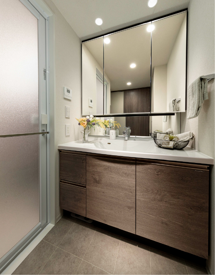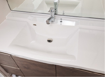 近くて見やすい鏡と奥行きのある鏡裏収納、継ぎ目が無い上品で美しいフォルムのボウル一体型カウンターなどを備えた洗面化粧台です。