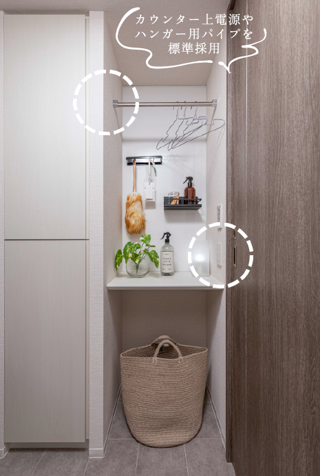 洗面室には「衣類等の収納」、「洗濯にまつわる作業」、「身支度」などを快適に使い分けることができる多機能スペース「ユーディ」を採用。ライフスタイルや家族ひとりひとりのニーズに応える新発想空間です。※一部タイプ除く