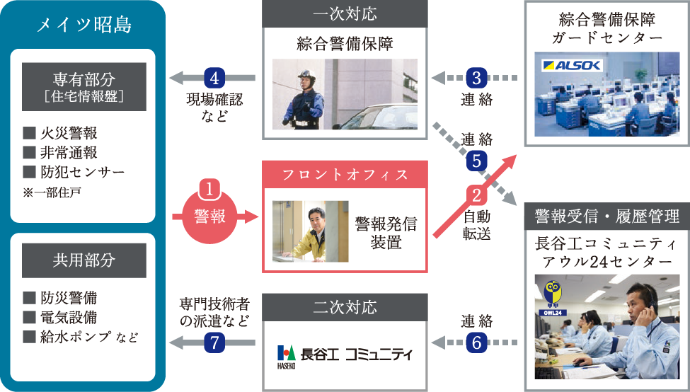 共用部・専有部内の各種警報に対してはALSOKのガードマンが現場に駆け付け、二次対応が必要な場合は長谷工コミュニティが別途技術者等を派遣し、速やかに建物・設備の異常に対応します。