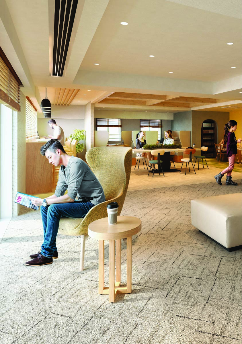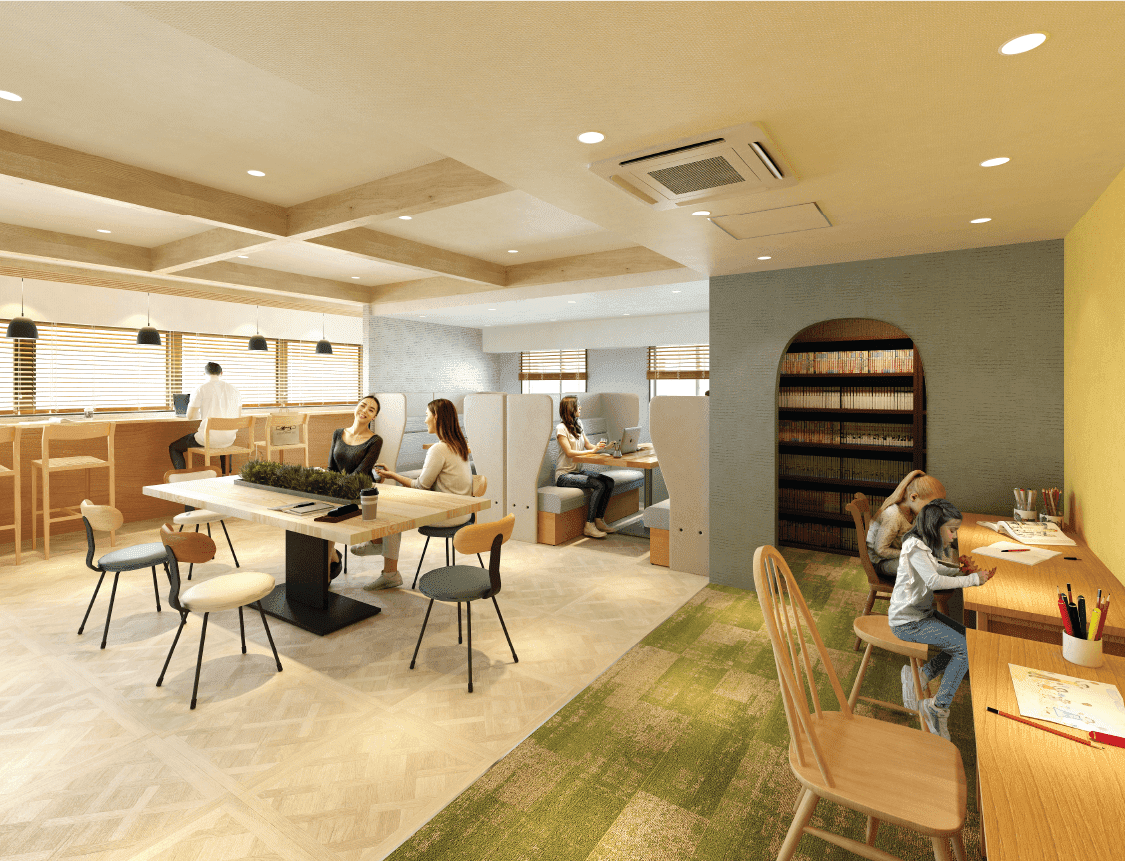 暮らし方や働き方が変わる時代に応える、メイツの新発想マンション内スペースです。Wi-Fiを完備しており、仕事にも勉強にもサークル活動にも使える場、子どもたちの学びの場など多目的に対応します。