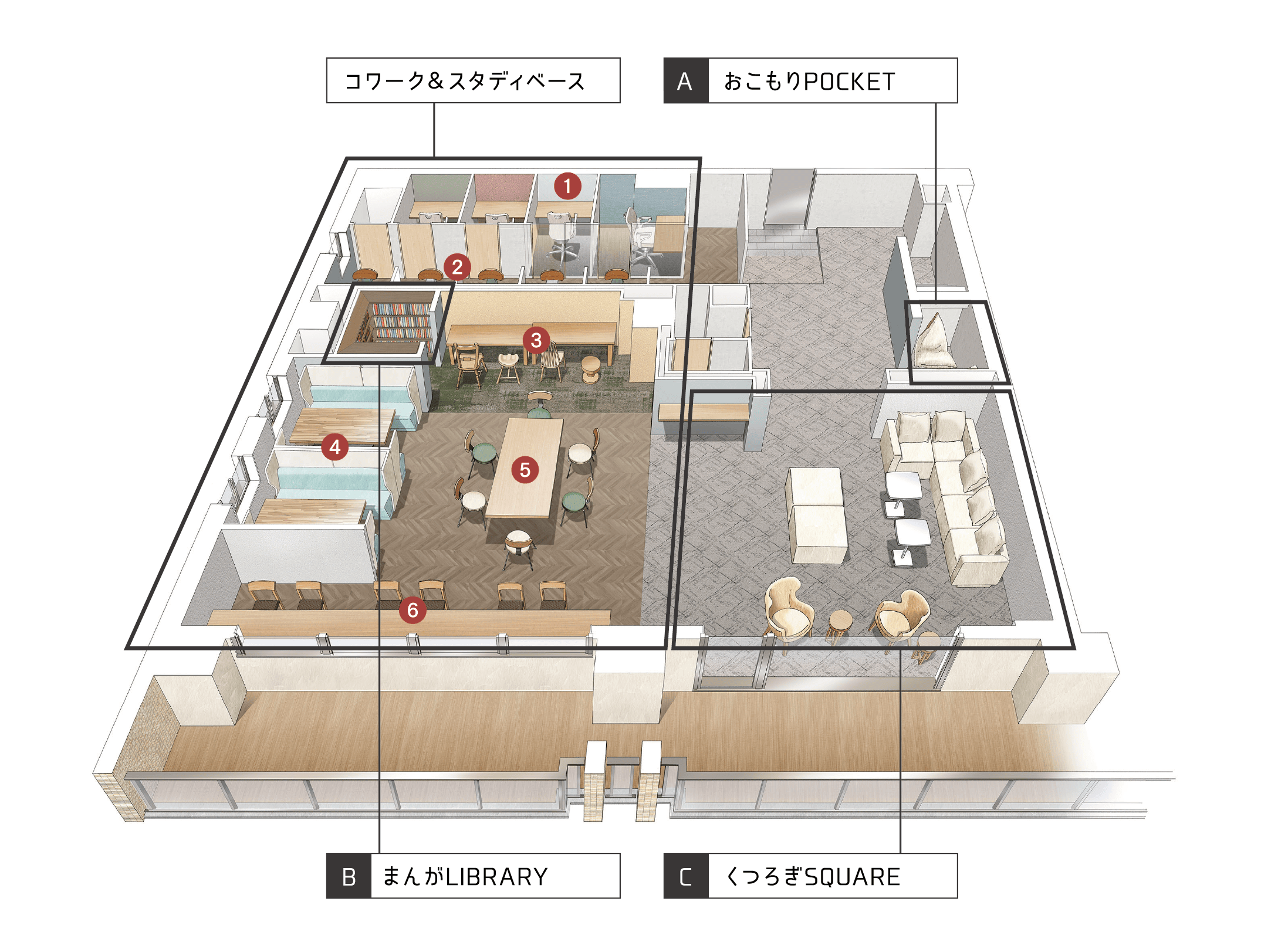 少人数でゆったり寛げるヌックのように居心地のよい休憩スペースです。