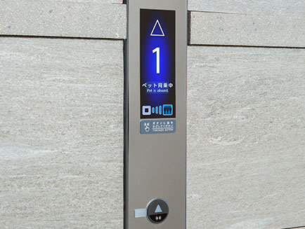 接触せずに操作できるタッチレスボタンで、衛生面も安心。さらにペット同乗ボタンを押せば、他の利用者にもペット同乗中がわかり、気遣いが広がるエレベーター空間に。