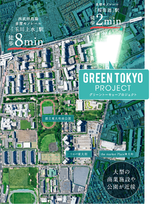 徒歩8分の「玉川上水」駅から西武拝島線で「高田馬場」へ。 徒歩2分の「桜街道」駅から多摩モノレールで「立川」・「高幡不動」へ。 東西と南北をクロスする2駅2路線のアクセスは、通勤も通学も休日のレジャーも、行動範囲を広げてくれます。