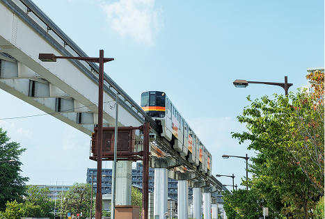 多摩モノレールの特徴として、踏切がなく、全駅にホームドアが設置されているなど保安設備が整っているため、安全性や定時性の確保に優れています。駅や車両はバリアフリー設計となっており、全駅にエレベーターや車いす・ベビーカー対応の乗降用スロープ、広めのトイレを設置しているほか、車内にも車いす・ベビーカー専用スペースを設置しているため、小さなお子様やシニアの方にも安心してご乗車いただけます。また、沿線には立川を中心とした商業エリアと、多摩動物公園、昭和記念公園などのレジャー施設に加え、玉川上水緑道や多摩丘陵にみられるような自然が豊かなエリアが共存しています。車窓から眺める富士山も魅力の一つで、夜の景観は「日本夜景遺産」に認定されています。