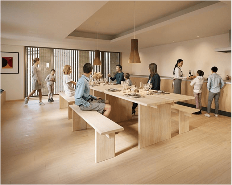 「北欧・スカンジナビアでは、友達を家に招きます。外食に行くより家に招いて夕食をともに、そんな時間がとても大切なのです」と笑顔で語るOEO Studio。「パーティールーム」はそんなライフスタイルを叶える空間。仲間とのパーティ、子ども向けお菓子教室、ヨガスタジオなど、様々な用途に活用できるよう工夫されています。