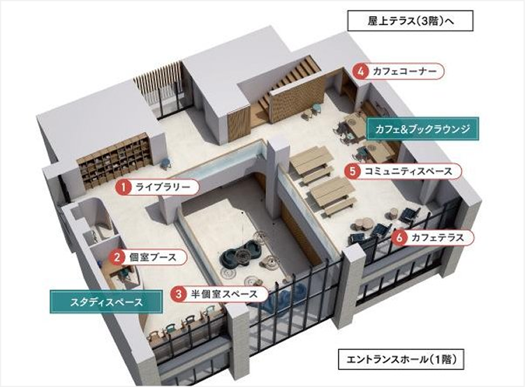 「カフェ&ブックラウンジ」と「スタディスペース」