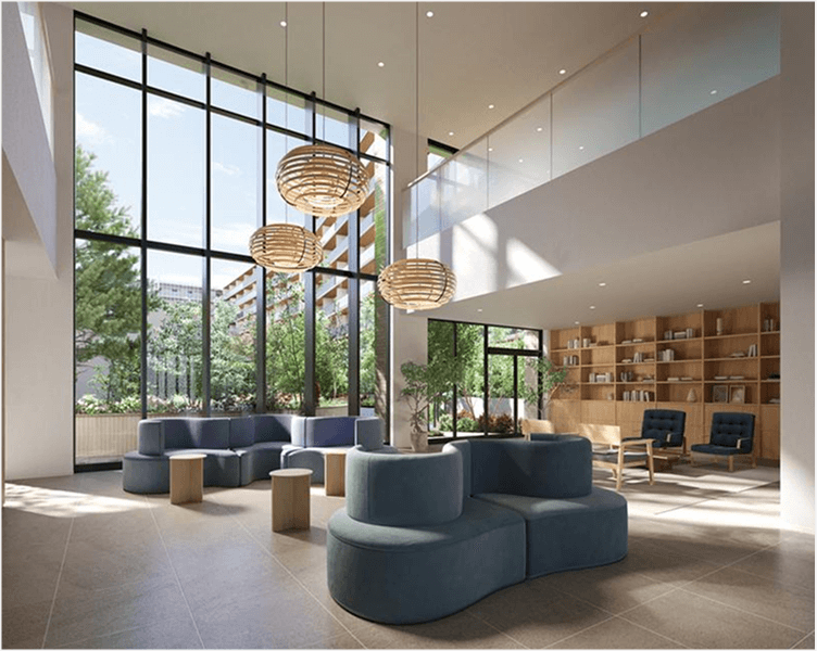 2層吹抜けの開放感、中庭の緑とインテリアが印象的なエントランスホール/完成予想CG