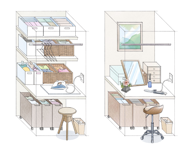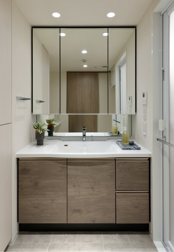 三面鏡の裏には、メイク用品や洗面小物が入る収納スペースを設けています。