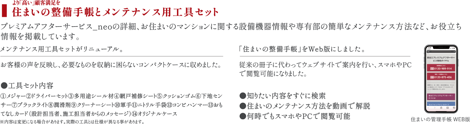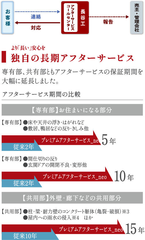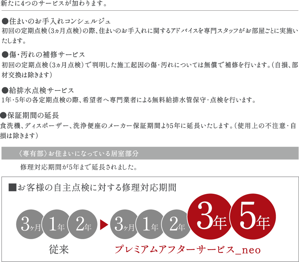 お客様がマンションのお引き渡し時やお住まいになってからいただく多くのご意見やご要望を反映。施工中の各種品質検査のほか技術専門スタッフによる中間・竣工検査を実施し、細やかな施工管理体制を取ることで、従来よりも長いアフターサービス期間と高品質なプレミアムアフターサービス_neoをご提供します。