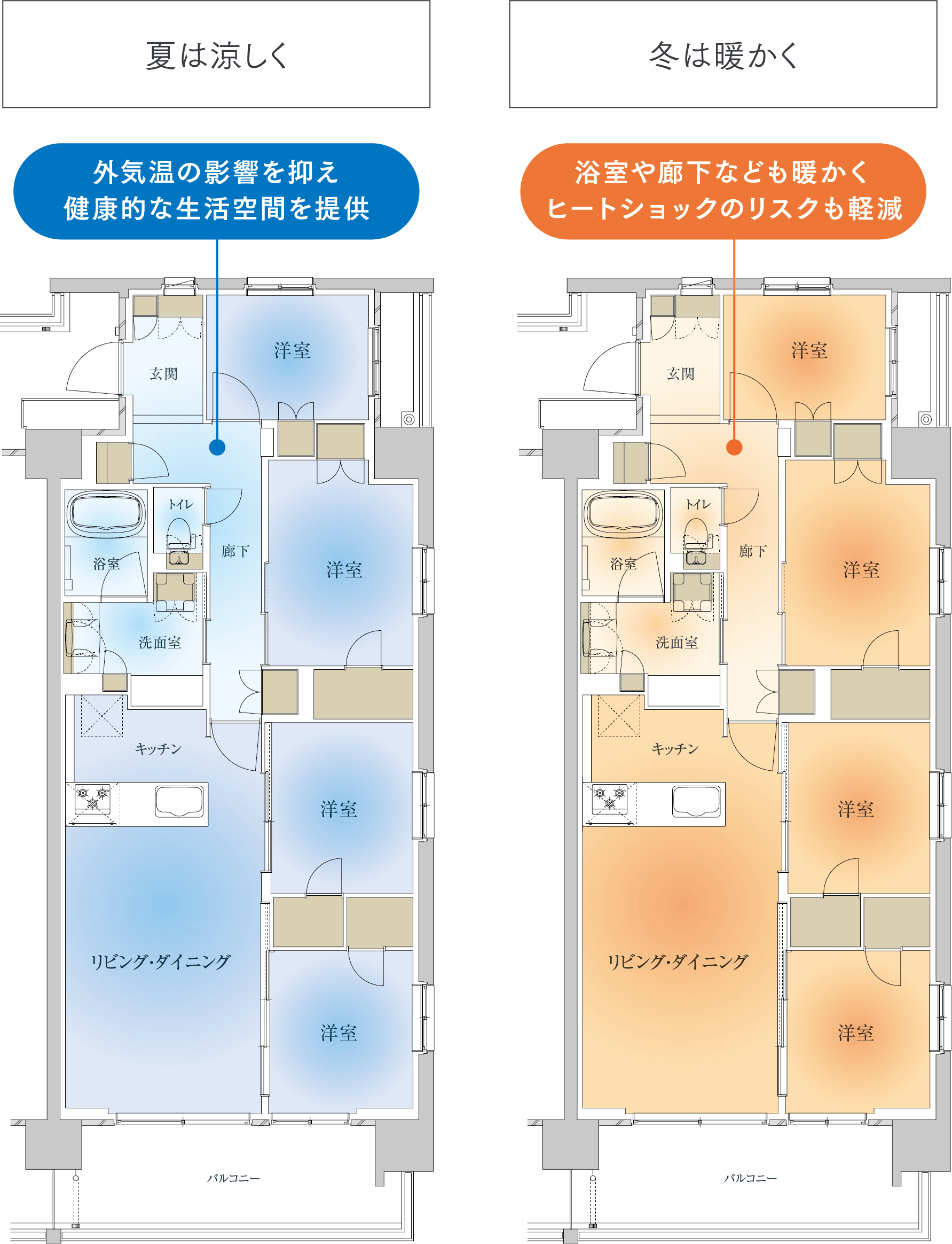 断熱性能の高い住まいは「冬は暖かく夏は涼しい」身体にやさしい住まい。冬は家の中の熱を逃さず、夏は外からの熱を抑えます。部屋間の温度差も小さくなり、一年を通じて快適に暮らすことができます。